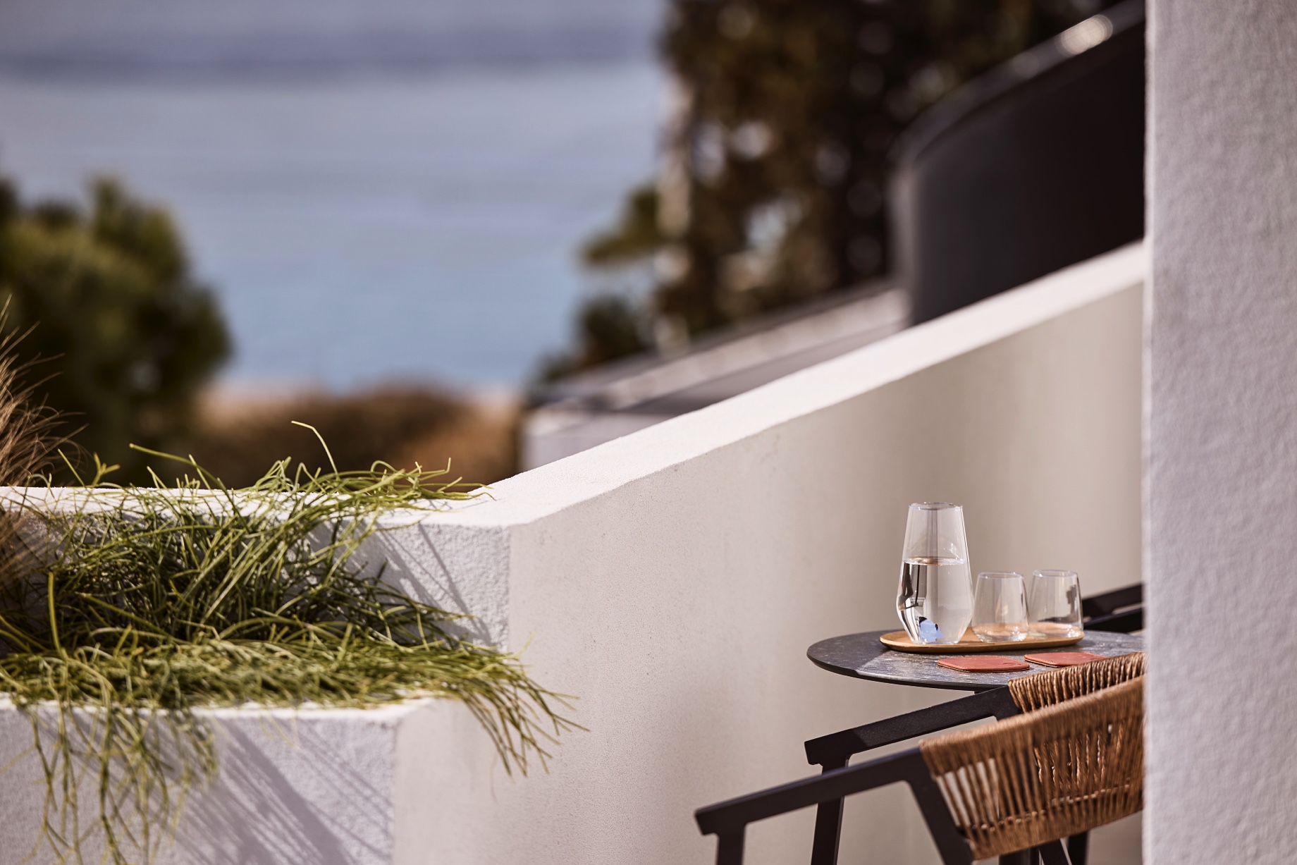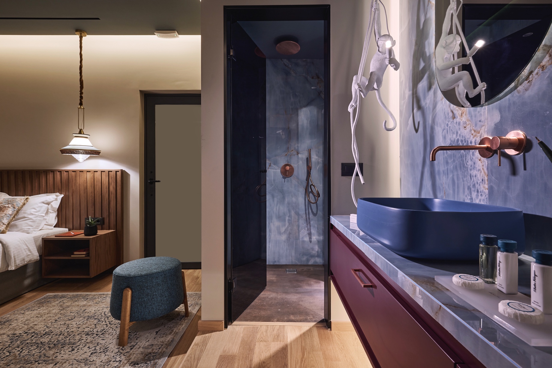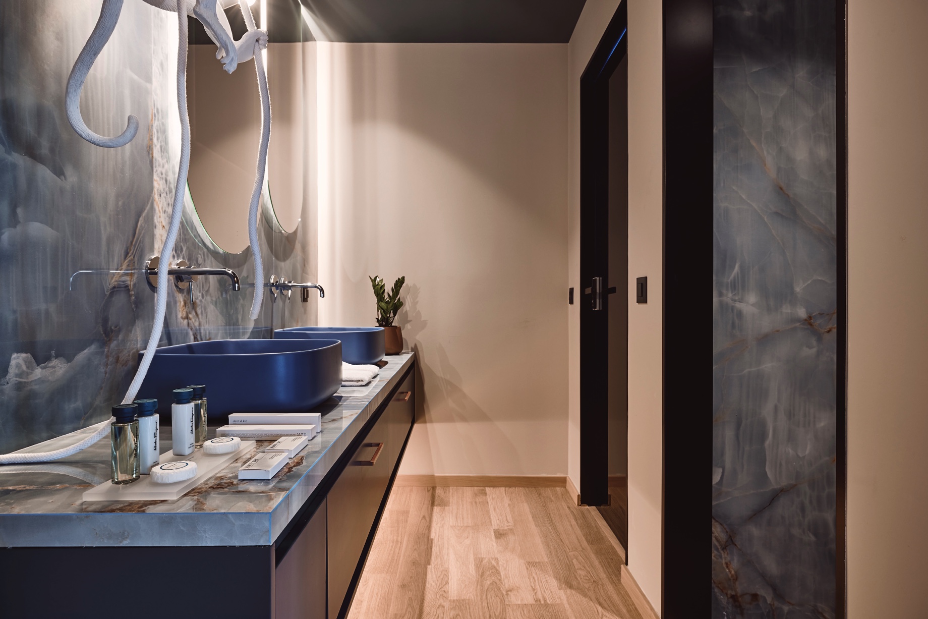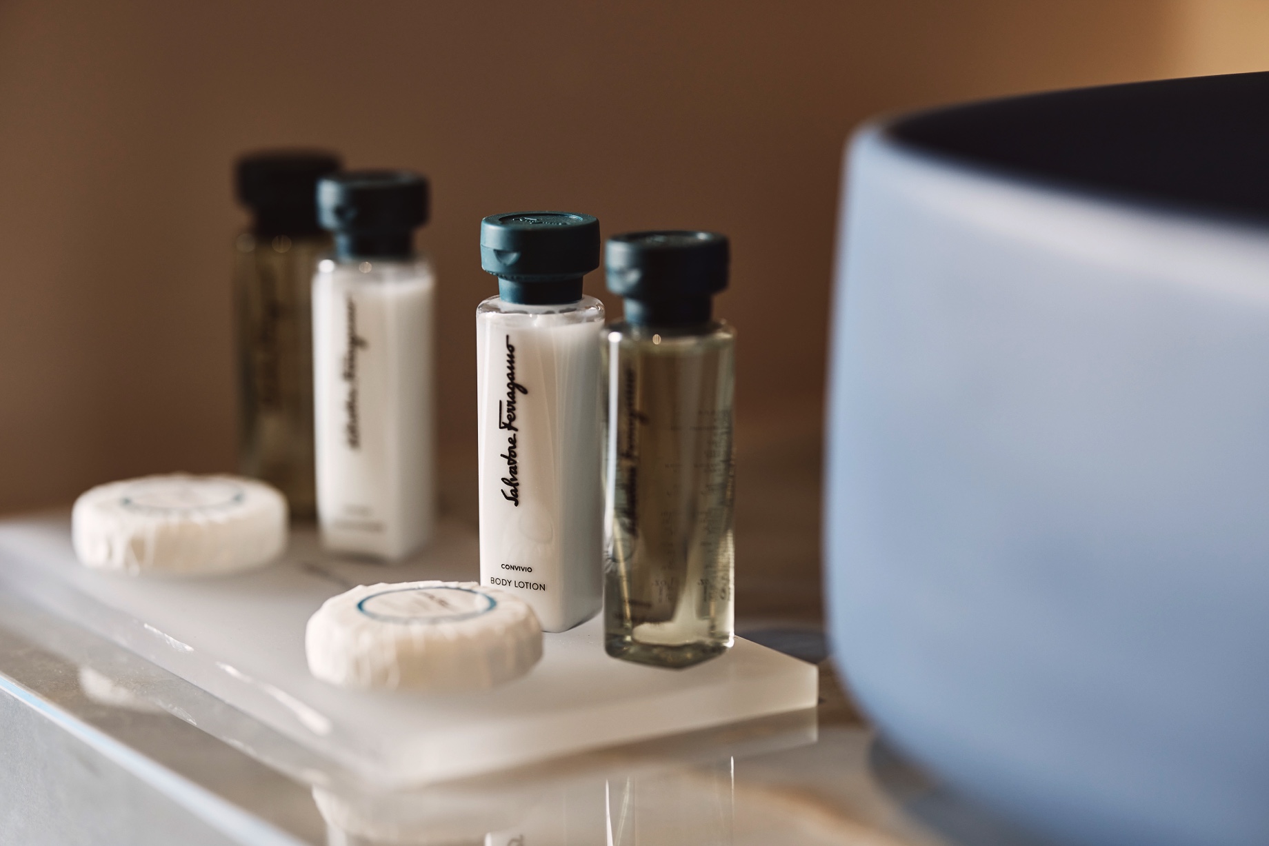 The Deluxe Double Room with Side Sea View can accommodate up to 2 guests. It offers a king-size bed, monitor lifted TV, a specially decorated bathroom with two handmade stone washbasins and Salvatore Ferragamo toiletries. The suite has a comfortable living room, office desk, hidden lighting and details carefully selected with passion for the care of our guests.