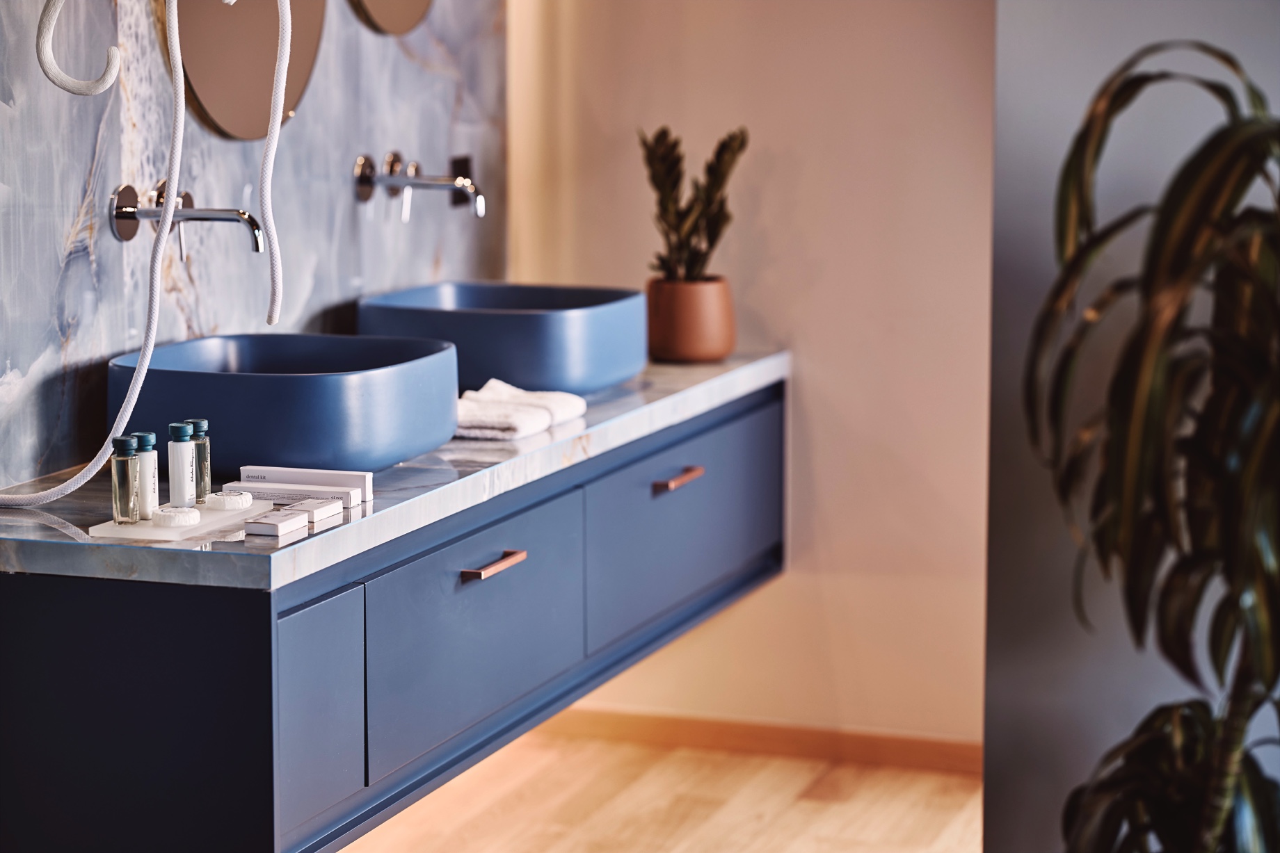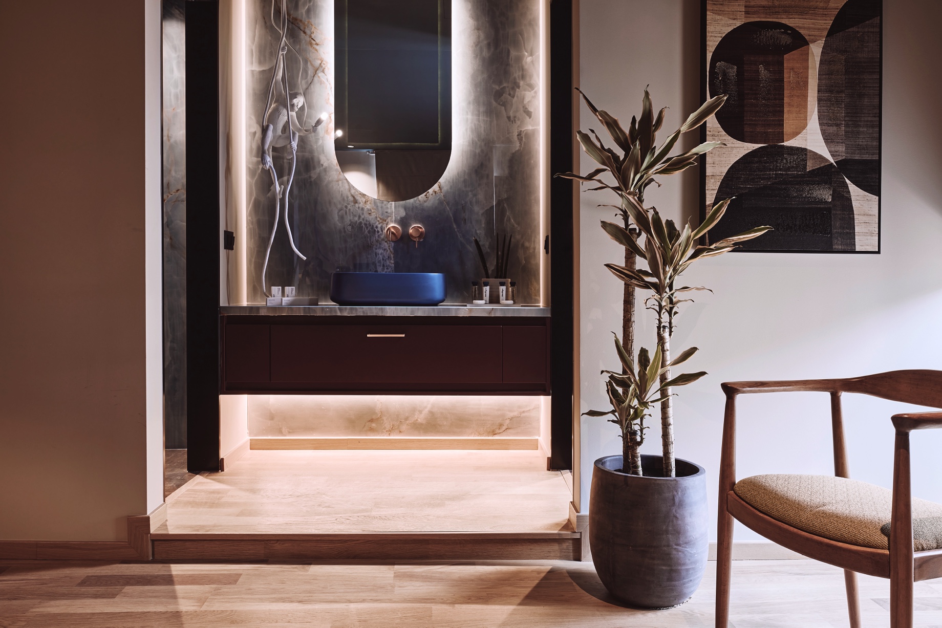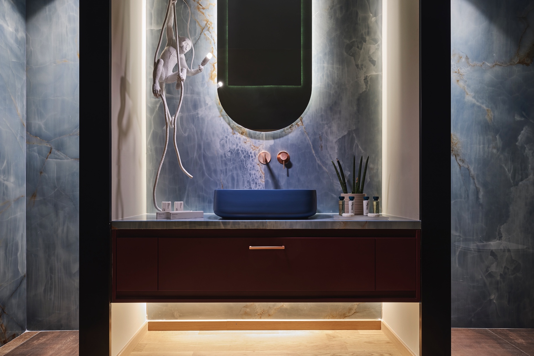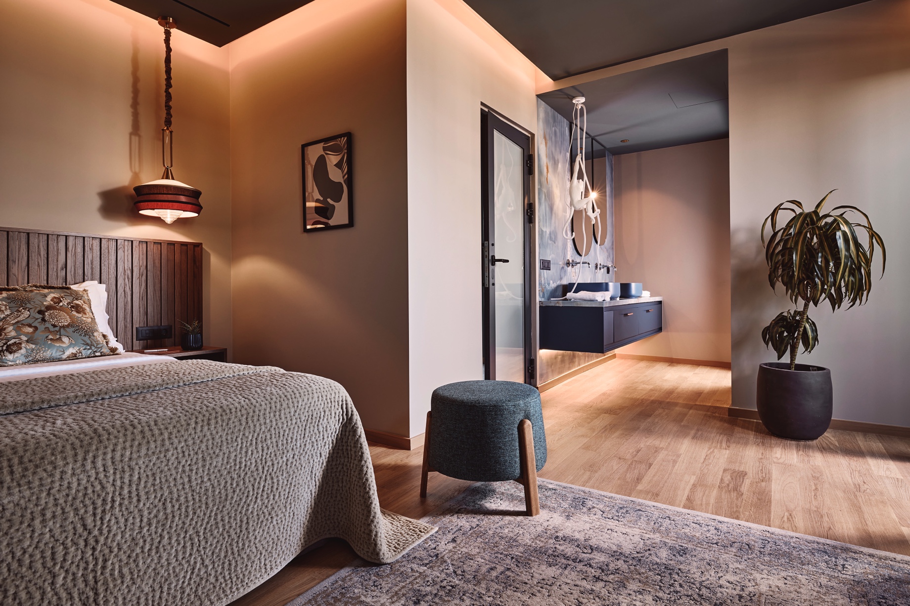 The Deluxe Double Room with Side Sea View can accommodate up to 2 guests. It offers a king-size bed, monitor lifted TV, a specially decorated bathroom with two handmade stone washbasins and Salvatore Ferragamo toiletries. The suite has a comfortable living room, office desk, hidden lighting and details carefully selected with passion for the care of our guests.