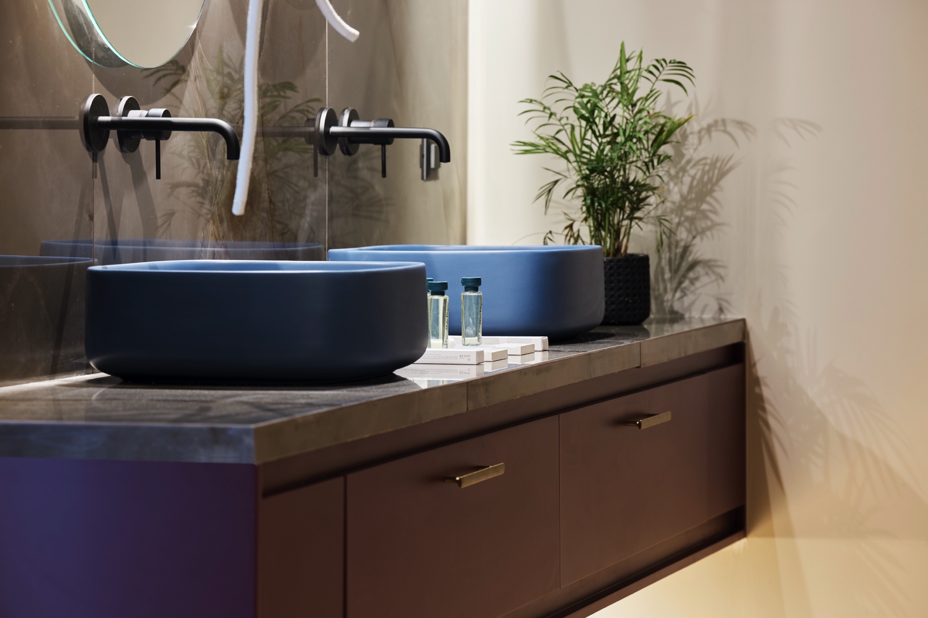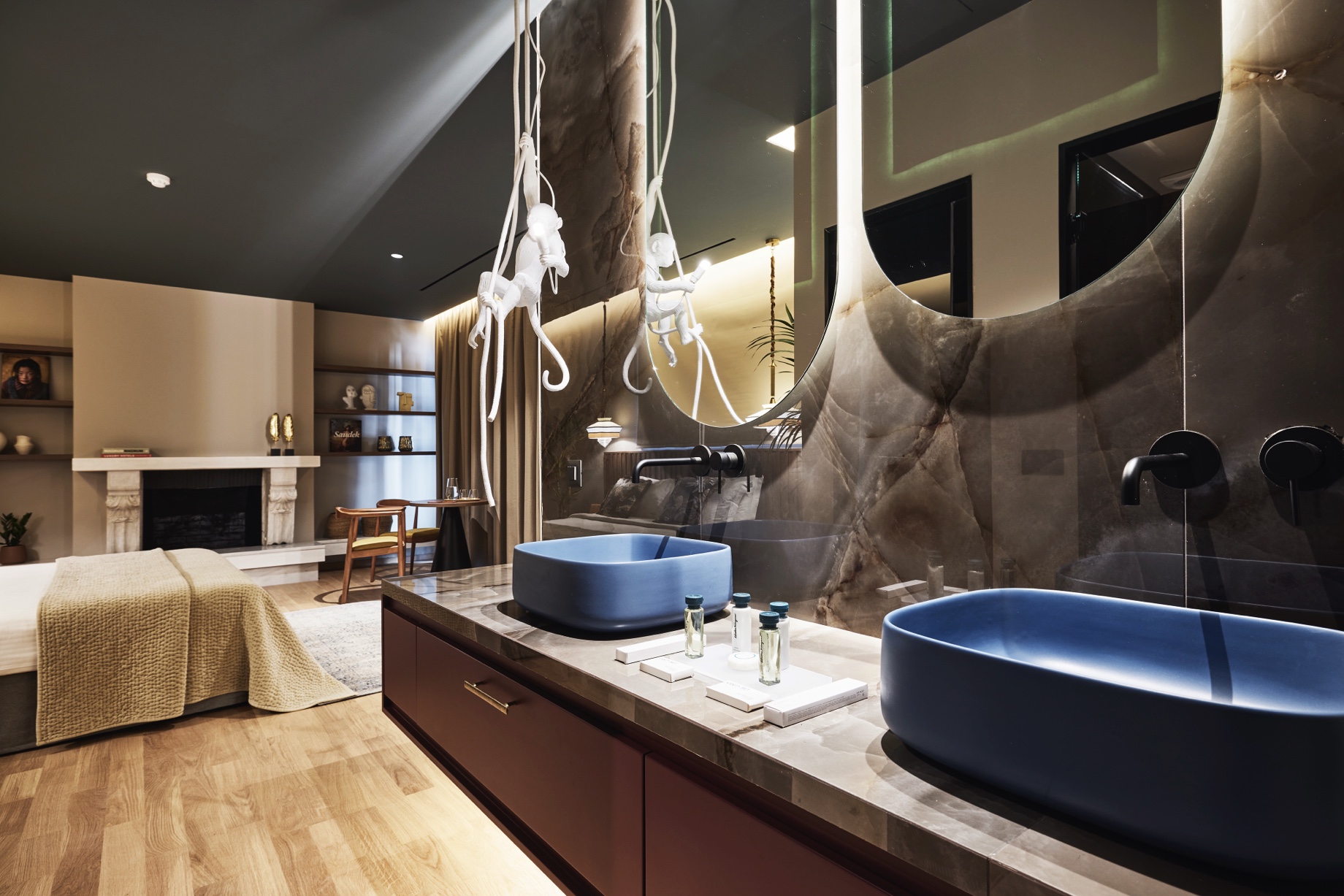 The Superior Suite with Sea View  can accommodate up to 2 guests. It offers a king-size bed, monitor lifted TV, a specially decorated bathroom with two handmade stone washbasins and Salvatore Ferragamo toiletries. The suite  has a comfortable living room, office desk, hidden lighting and details carefully selected with passion for the care of our guests.